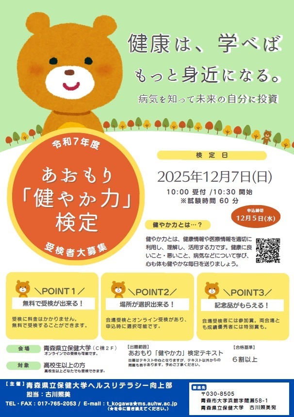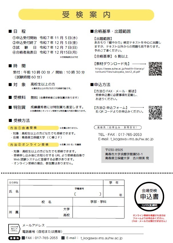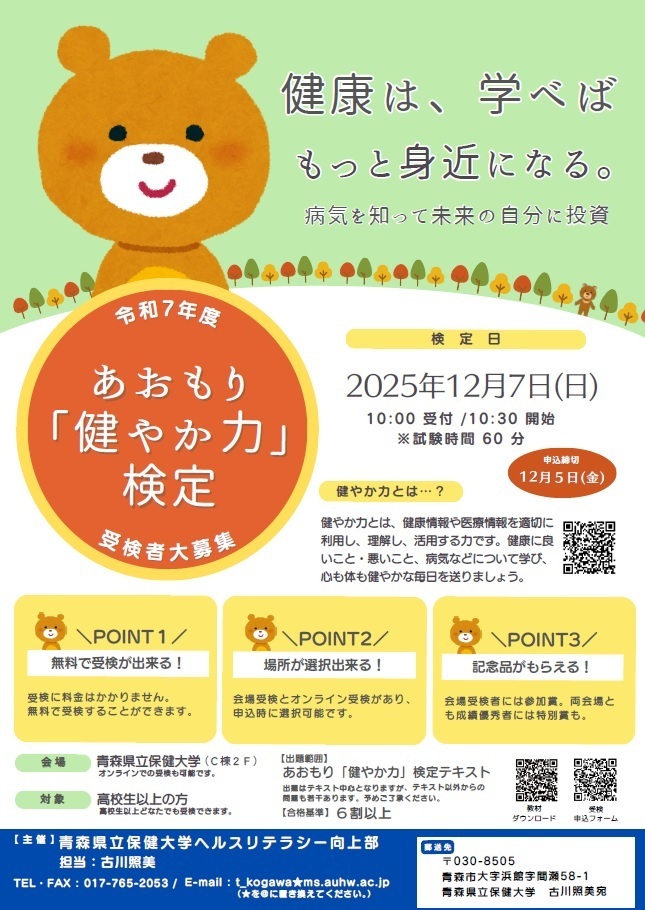 この検定は、青森県が平成26年度、27年度に実施した『健やか力検定』を引き継ぎ、平成28年度に本学が立ち上げた「ヘルスリテラシー向上部」を中心として、実施している検定です。